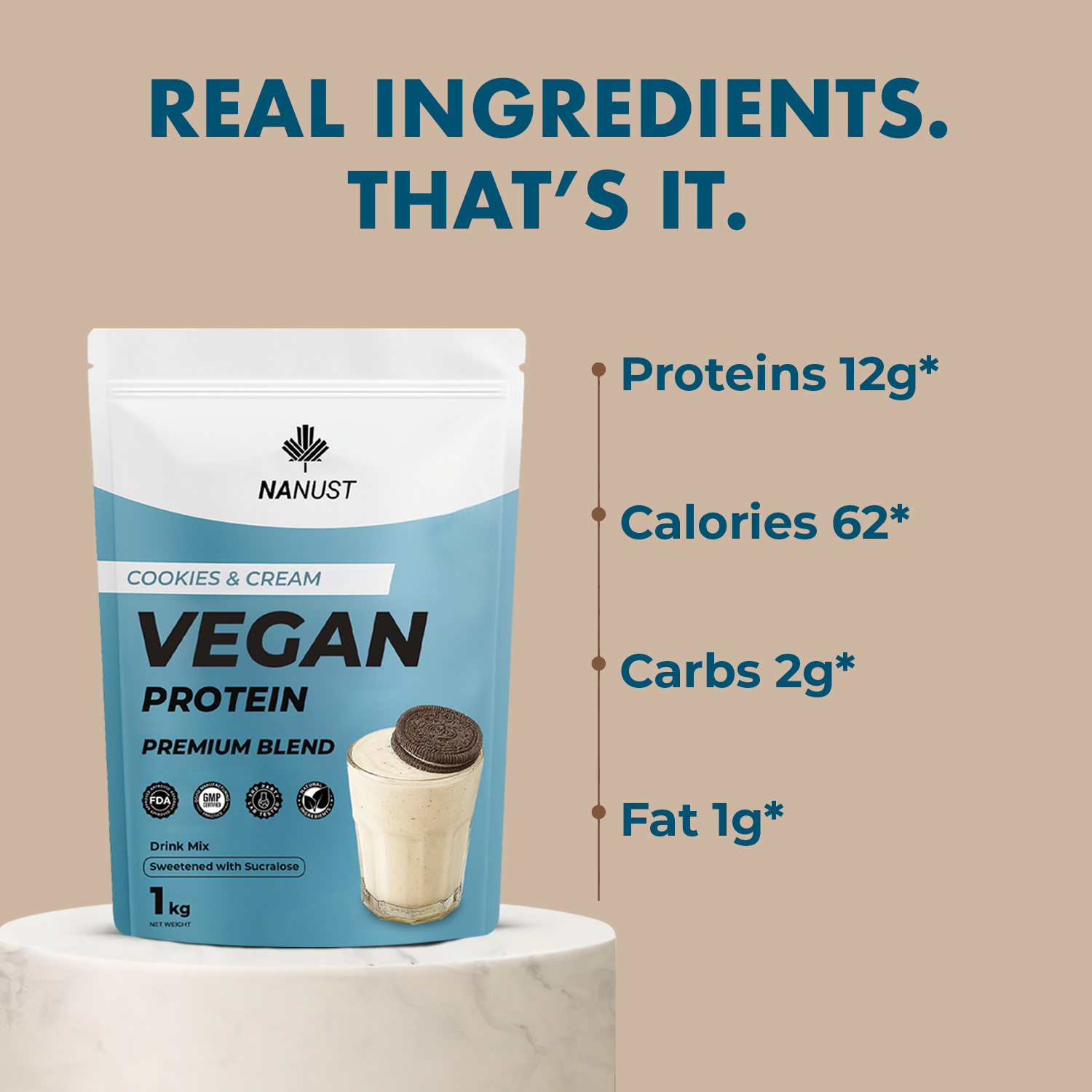 Ingredients: Pea protein product, Brown rice protein product, Hemp protein product, Natural flavour, Xanthan gum, Reb A (Steviol glycosides), Salt